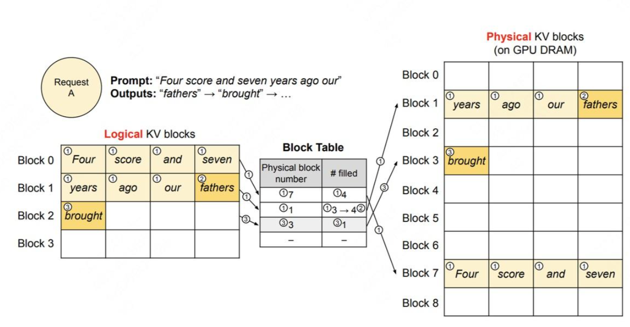 圖中的一個block就是一個page,在vLLM裡一個block可以裝16個token的KV data。