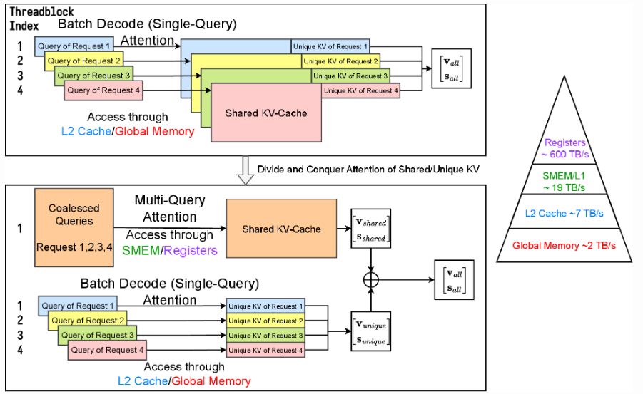 上格是naive作法,對於多個request是獨立處理的,並把KV Cache存在L2 Cache/Global Memory,相對低效。若把前綴相同的部分share起來,shared KV Cache存在SMEM/Registers,在移動shared KV Cache上可以memory efficient。最高可以達到30x的效率收益。