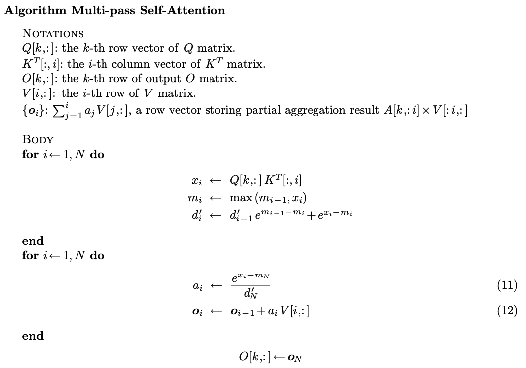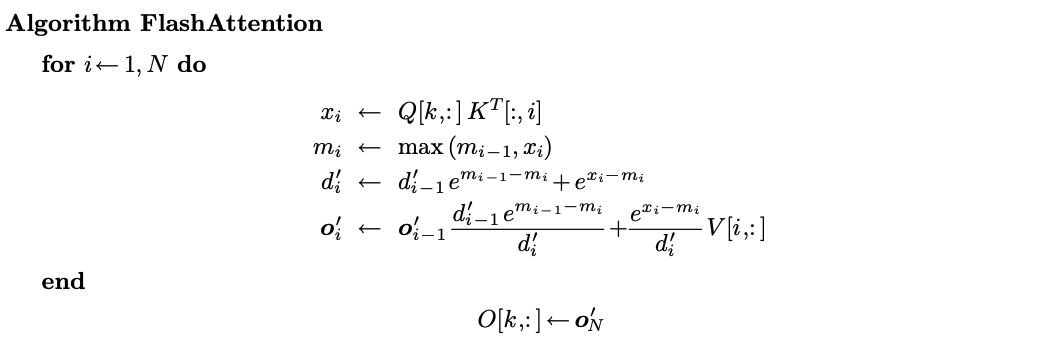 雖然成功節省顯存,我們卻需要iterate N sequence三次,這樣在系統上是I/O inefficient的,如果把前兩個operation fuse在一起,可以減少data搬運次數,但我們發現第二個計算是depends on ,不能把他fuse在同一個loop裡,於是就有了online softmax,的遞迴性質: